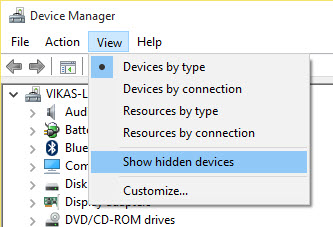 - Expand the top node, and then look for devices with a yellow color exclamation mark. If no such devices are found, make sure the Show hidden devices option is checked-up from the View menu.