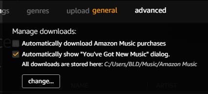 4. Switch to general and notice where the music files are stored after downloading them from the Amazon Store. The default location is %userprofile%/Music/Amazon Music