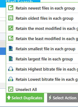 14. Find the Select Duplicates button at the bottom of the Clone Files Checker. Select it and then select Retain newest files in each group. This makes sure only the newest files are kept and all older versions of that file are removed.