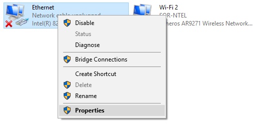 - Locate Ethernet (or a similar network connection) and select Properties from the context menu.